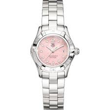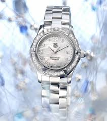 Elegant mother-of-pearl dial set with diamonds. Date at 3 o’clock. Monochrome TAG Heuer logo. “AQUARACER - 300 meters” inscription.